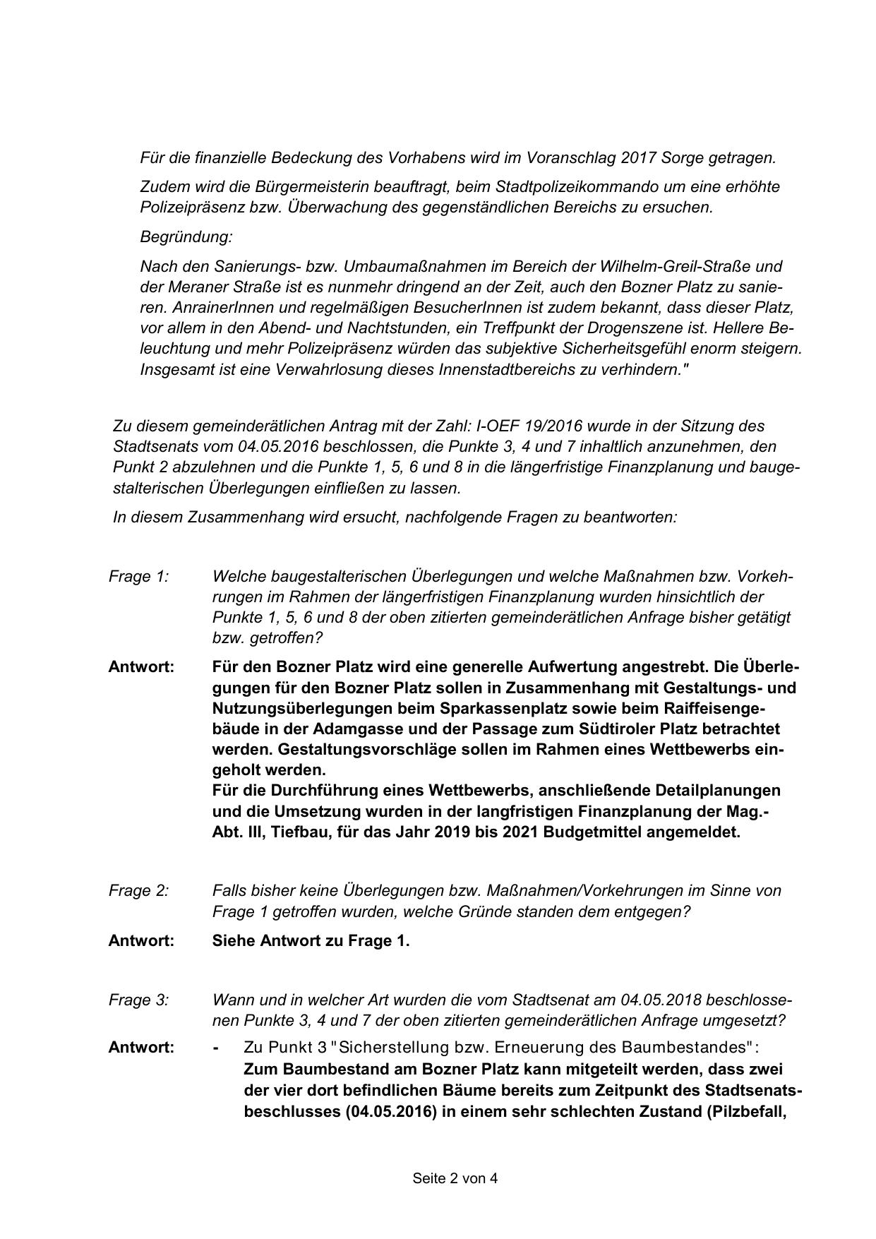 der Meraner Straße ist es nunmehr dringend an der Zeit, auch den Bozner Platz zu sanieren. AnrainerInnen und regelmäßigen BesucherInnen ist zudem bekannt, dass dieser Platz,