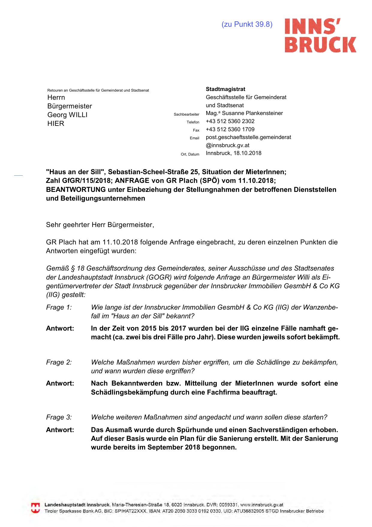 GR Plach hat am 11.10.2018 folgende Anfrage eingebracht, zu deren einzelnen Punkten die