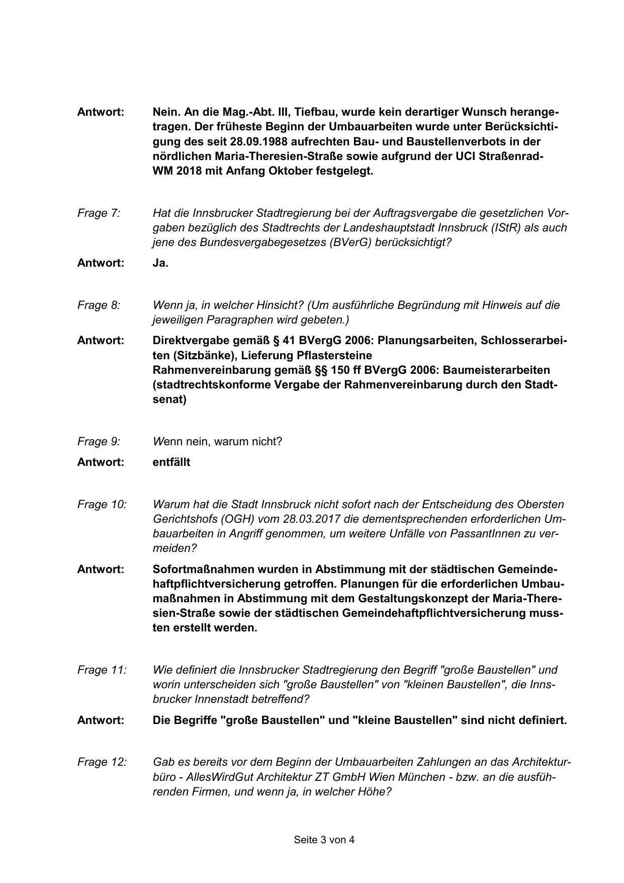 Hat die Innsbrucker Stadtregierung bei der Auftragsvergabe die gesetzlichen Vorgaben bezüglich des Stadtrechts der Landeshauptstadt Innsbruck (IStR) als auch