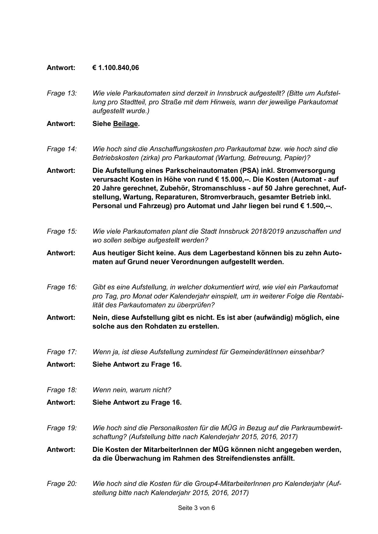 Wie viele Parkautomaten sind derzeit in Innsbruck aufgestellt? (Bitte um Aufstellung pro Stadtteil, pro Straße mit dem Hinweis, wann der jeweilige Parkautomat