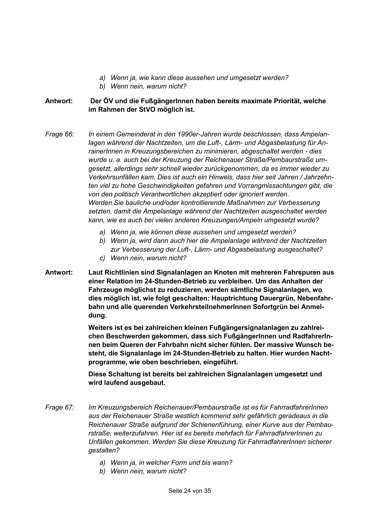 Weiters ist es bei zahlreichen kleinen Fußgängersignalanlagen zu zahlreichen Beschwerden gekommen, dass sich FußgängerInnen und RadfahrerInnen beim Queren der Fahrbahn nicht sicher fühlen. Der massive Wunsch besteht, die Signalanlage im 24-Stunden-Betrieb zu halten. Hier wurden Nachtprogramme, wie oben beschrieben, eingeführt.