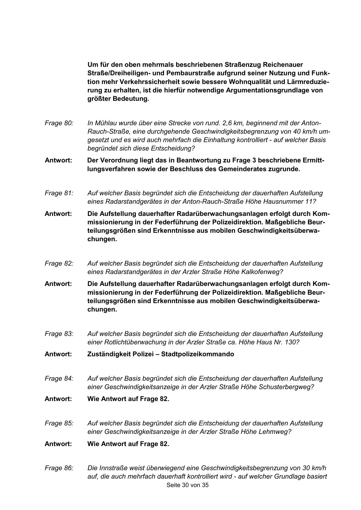 In Mühlau wurde über eine Strecke von rund. 2,6 km, beginnend mit der AntonRauch-Straße, eine durchgehende Geschwindigkeitsbegrenzung von 40 km/h umgesetzt und es wird auch mehrfach die Einhaltung kontrolliert - auf welcher Basis