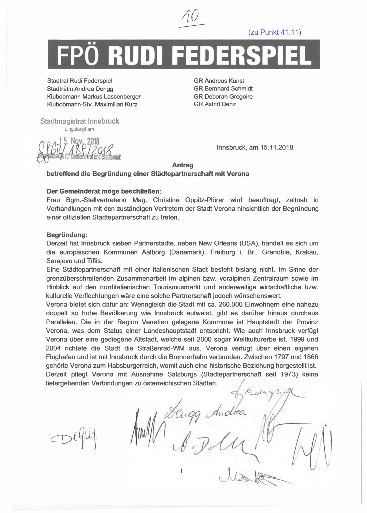 betreffend die Begründung einer Städtepartnerschaft mit Verona