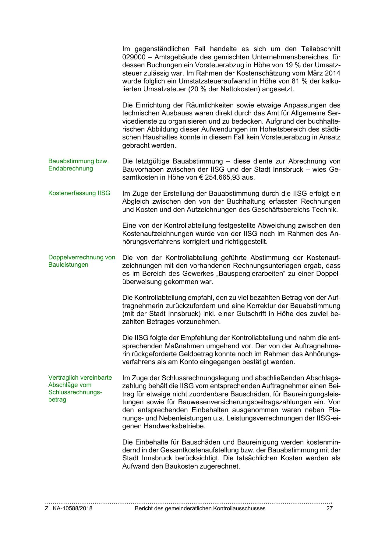 Bauvorhaben zwischen der IISG und der Stadt Innsbruck – wies Gesamtkosten in Höhe von € 254.665,93 aus.