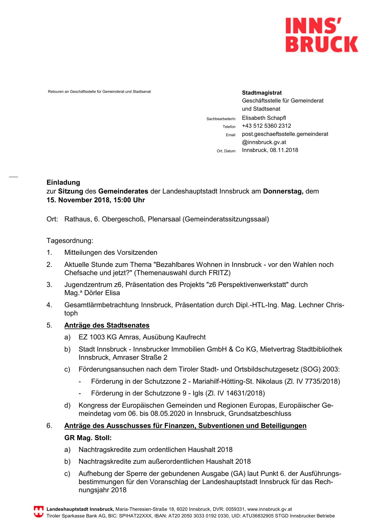 zur Sitzung des Gemeinderates der Landeshauptstadt Innsbruck am Donnerstag, dem