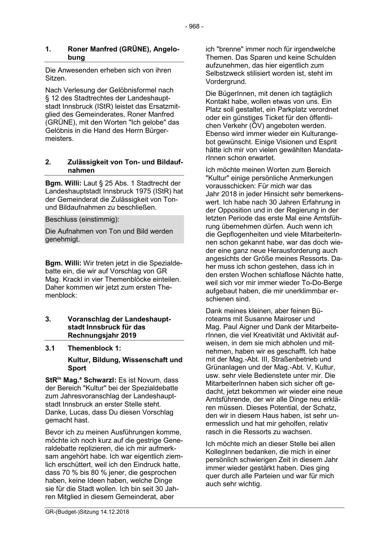 § 12 des Stadtrechtes der Landeshauptstadt Innsbruck (IStR) leistet das Ersatzmitglied des Gemeinderates, Roner Manfred