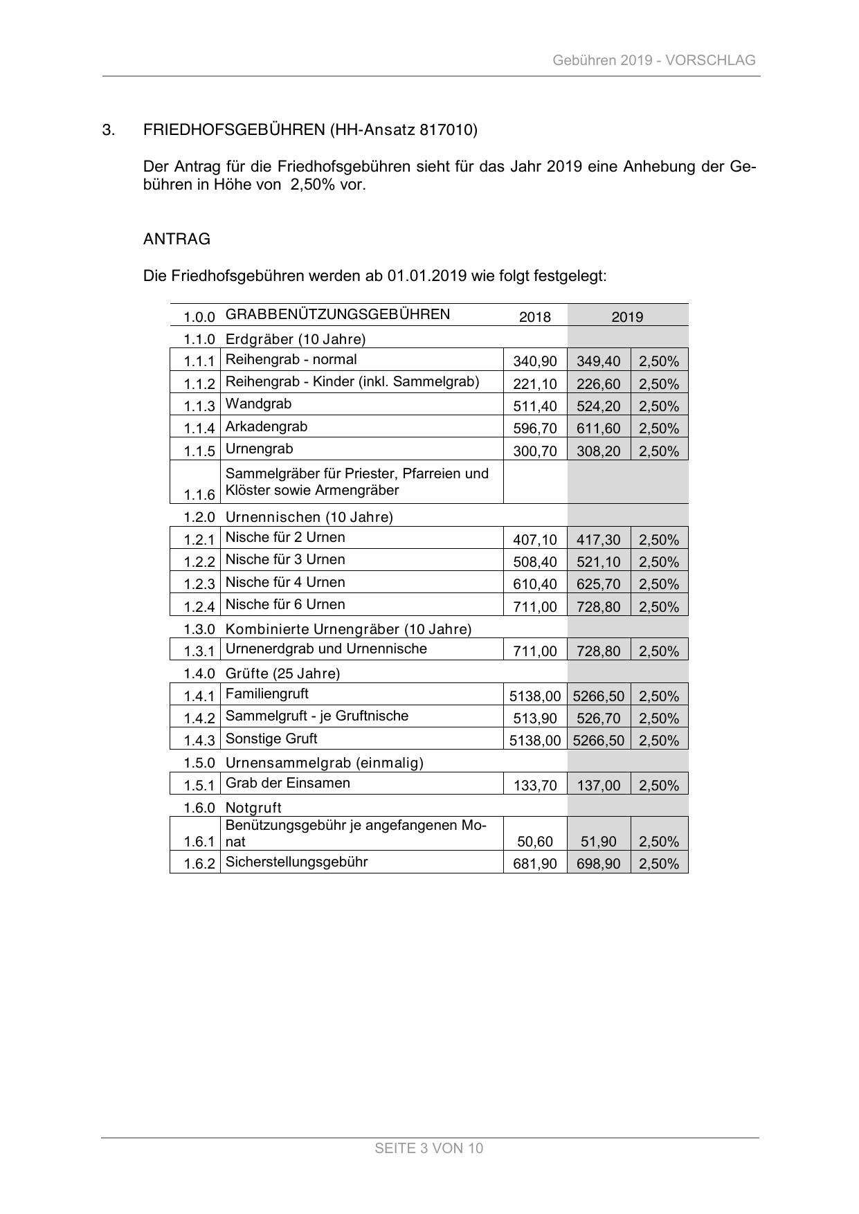 Der Antrag für die Friedhofsgebühren sieht für das Jahr 2019 eine Anhebung der Gebühren in Höhe von 2,50% vor.