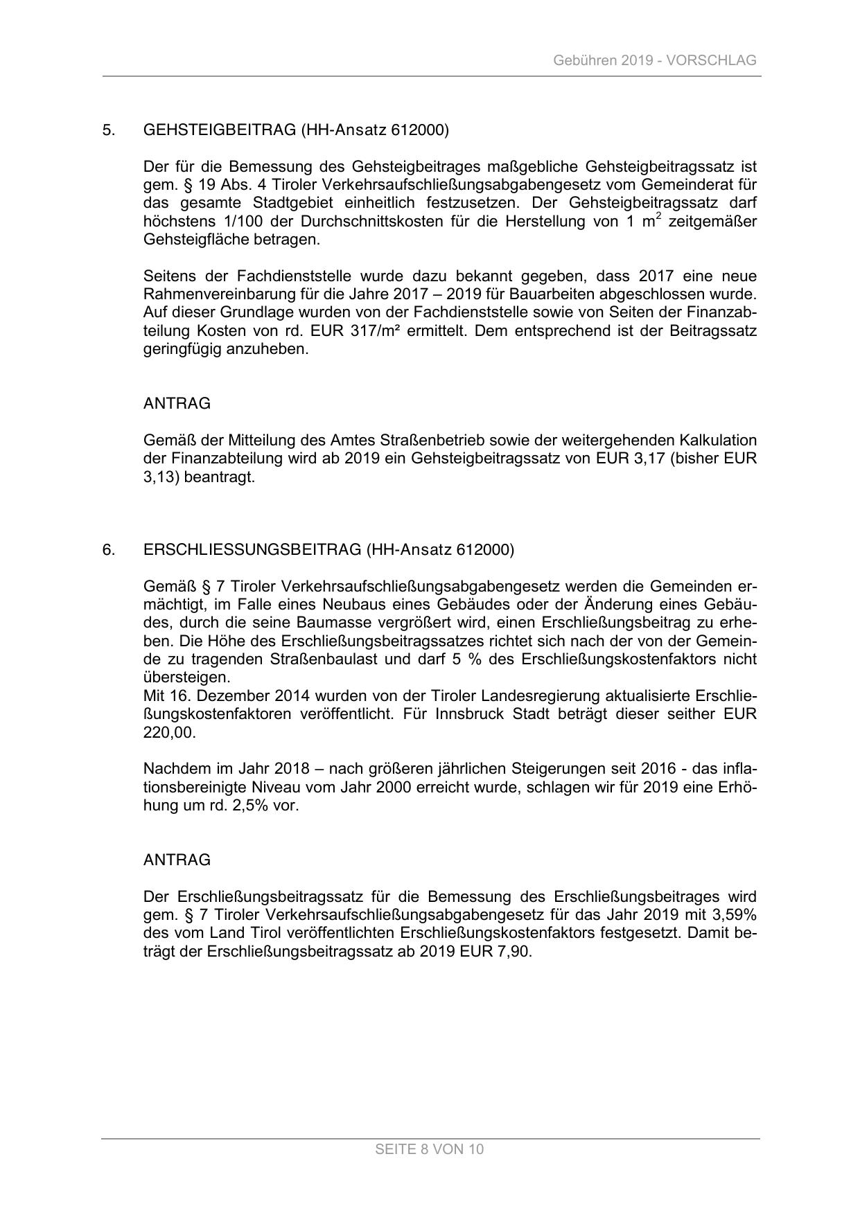 des vom Land Tirol veröffentlichten Erschließungskostenfaktors festgesetzt. Damit beträgt der Erschließungsbeitragssatz ab 2019 EUR 7,90.