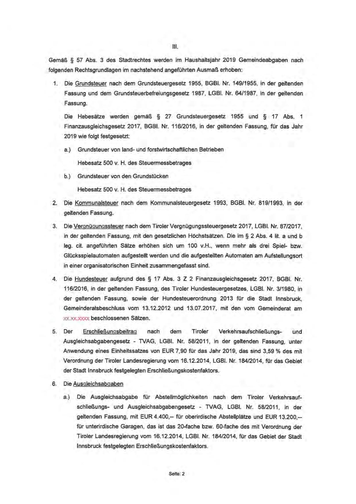 Gemäß § 57 Abs. 3 des Stadtrechtes werden im Haushaltsjahr 2019 Gemeindeabgaben nach