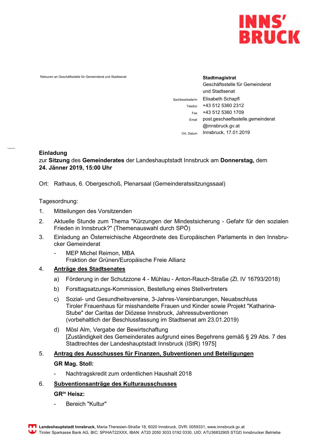 zur Sitzung des Gemeinderates der Landeshauptstadt Innsbruck am Donnerstag, dem