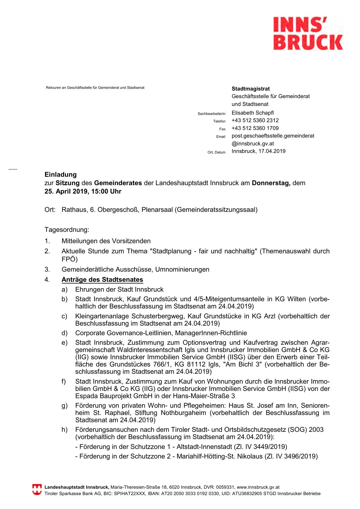 zur Sitzung des Gemeinderates der Landeshauptstadt Innsbruck am Donnerstag, dem