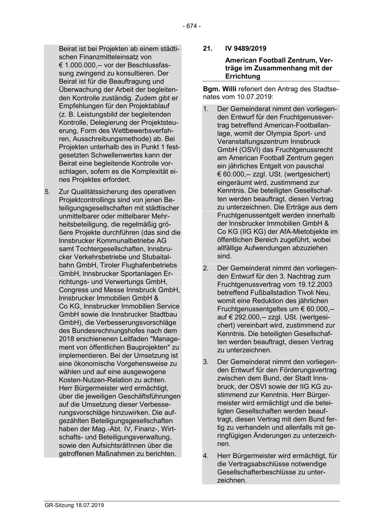 zwischen dem Bund, der Stadt Innsbruck, der OSVI sowie der IIG KG zustimmend zur Kenntnis. Herr Bürgermeister wird ermächtigt und die beteiligten Gesellschaften werden beauftragt, diesen Vertrag mit dem Bund fertig zu verhandeln und allenfalls mit geringfügigen Änderungen zu unterzeichnen.