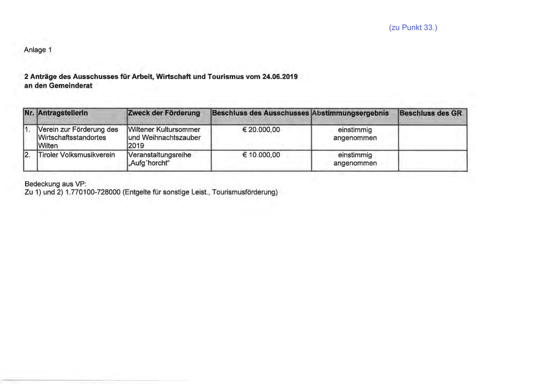 2 Anträge des Ausschusses für Arbeit, Wirtschaft und Tourismus vom 24.06.2019