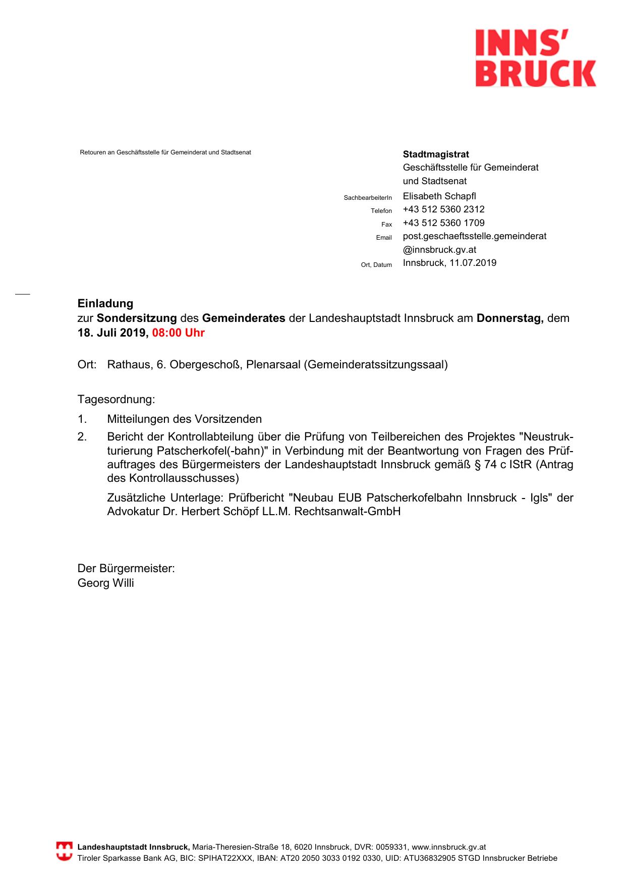 zur Sondersitzung des Gemeinderates der Landeshauptstadt Innsbruck am Donnerstag, dem