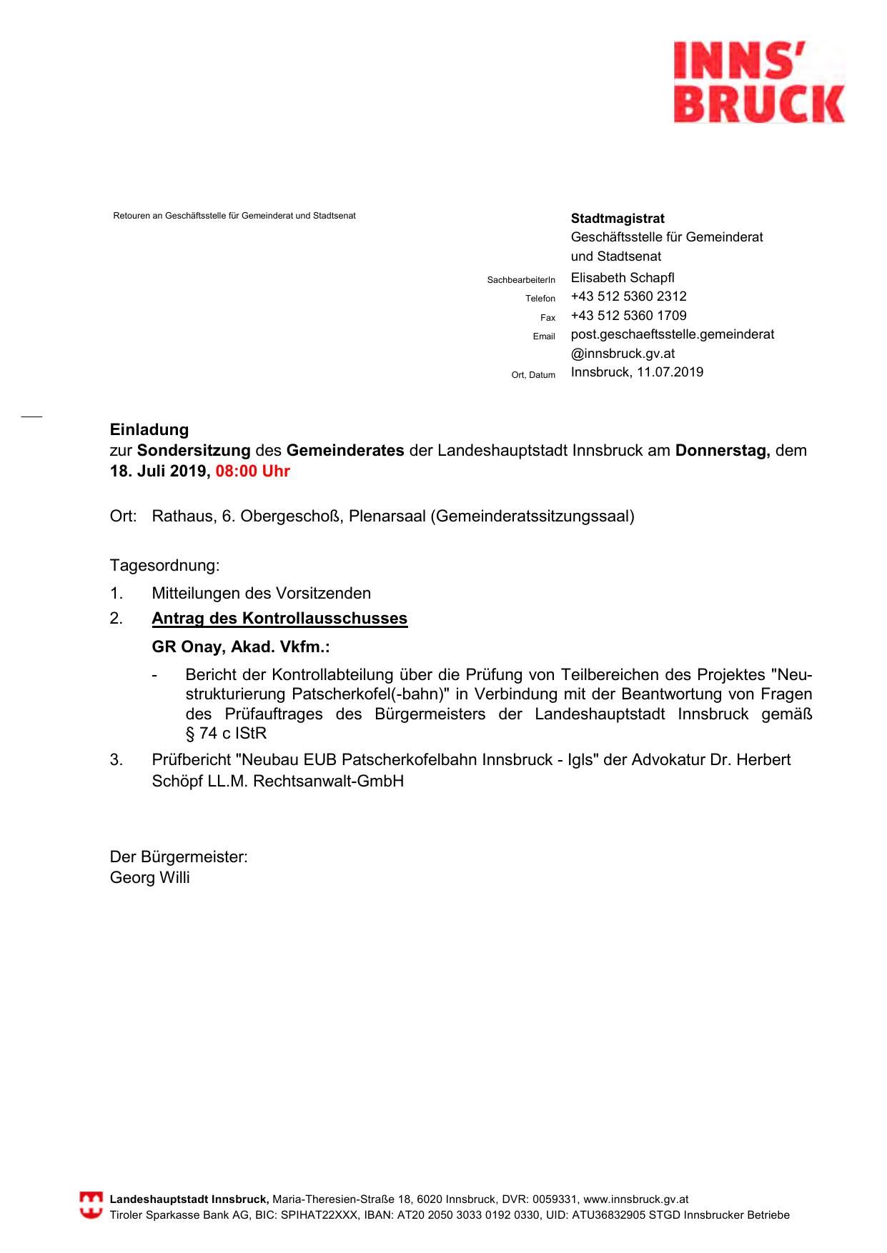zur Sondersitzung des Gemeinderates der Landeshauptstadt Innsbruck am Donnerstag, dem