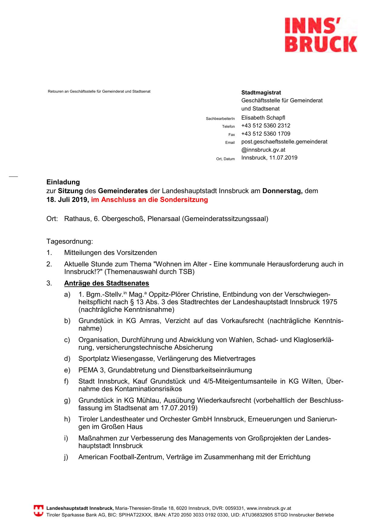 zur Sitzung des Gemeinderates der Landeshauptstadt Innsbruck am Donnerstag, dem