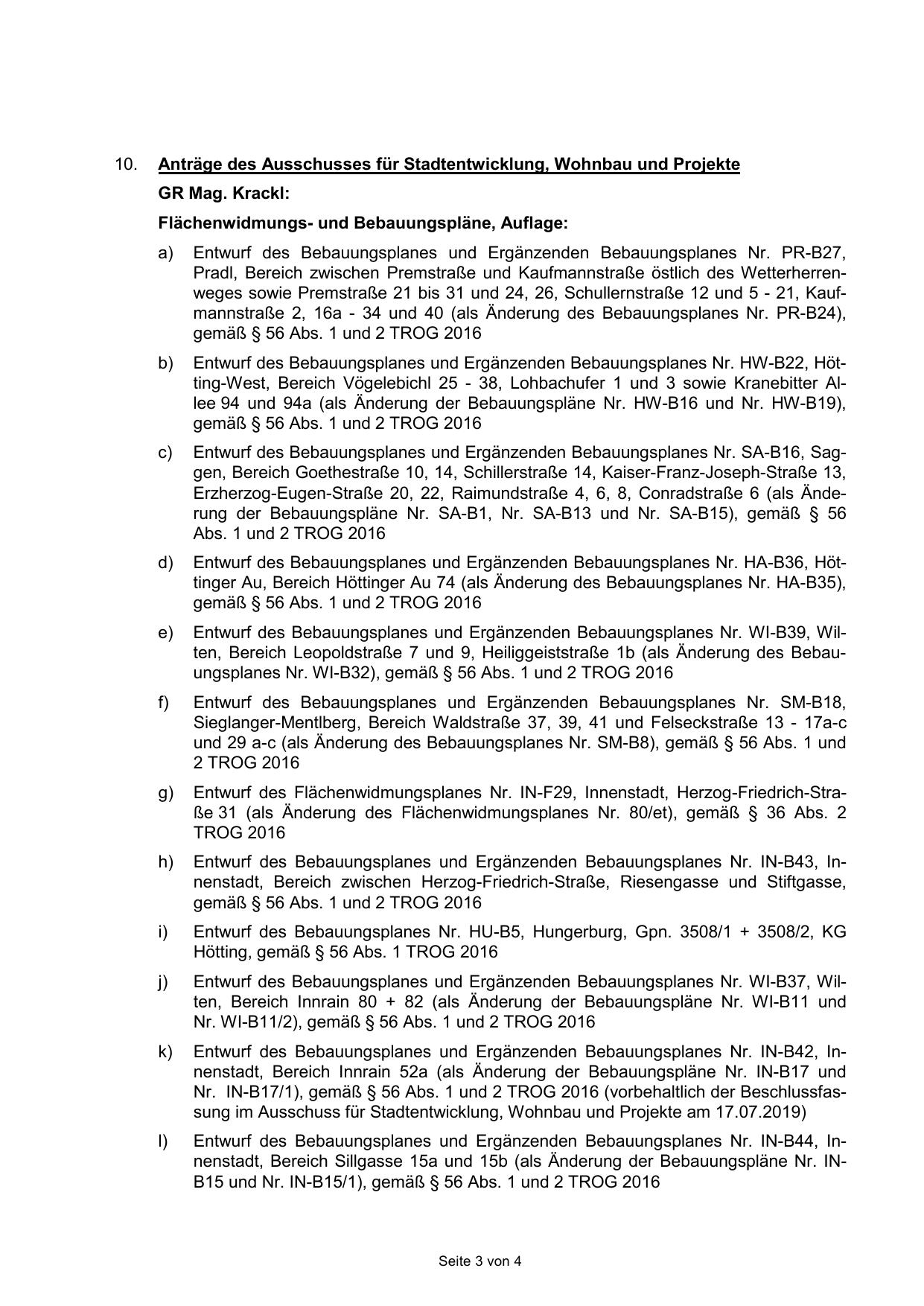 Nr. IN-B17/1), gemäß § 56 Abs. 1 und 2 TROG 2016 (vorbehaltlich der Beschlussfassung im Ausschuss für Stadtentwicklung, Wohnbau und Projekte am 17.07.2019)