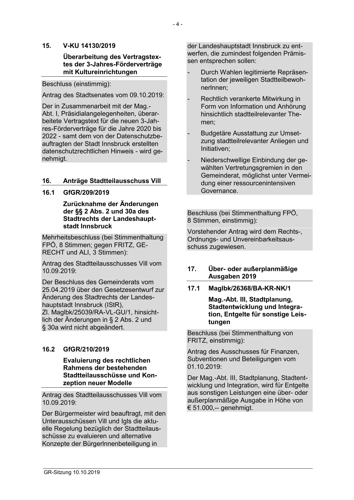 Unterausschüssen Vill und Igls die aktuelle Regelung bezüglich der Stadtteilausschüsse zu evaluieren und alternative