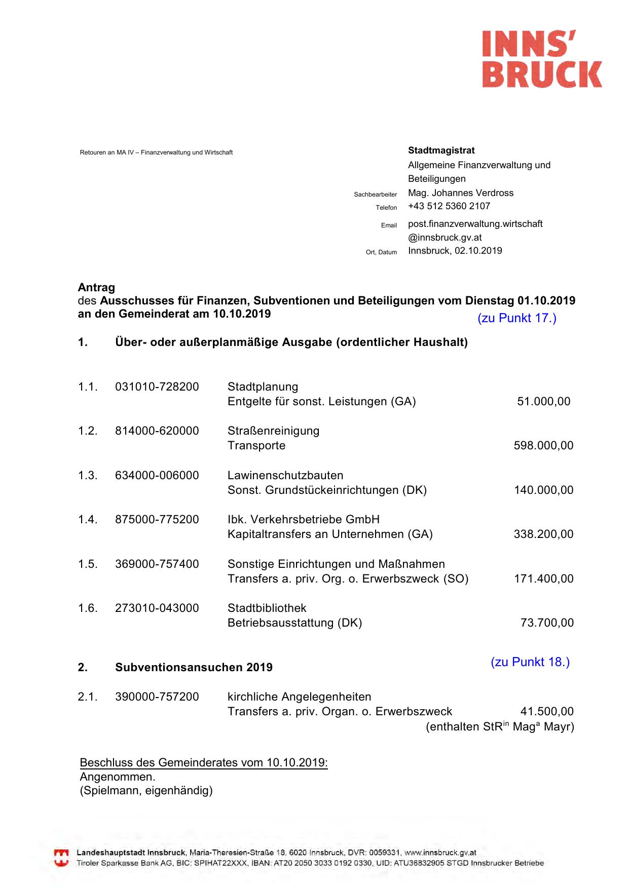 des Ausschusses für Finanzen, Subventionen und Beteiligungen vom Dienstag 01.10.2019
