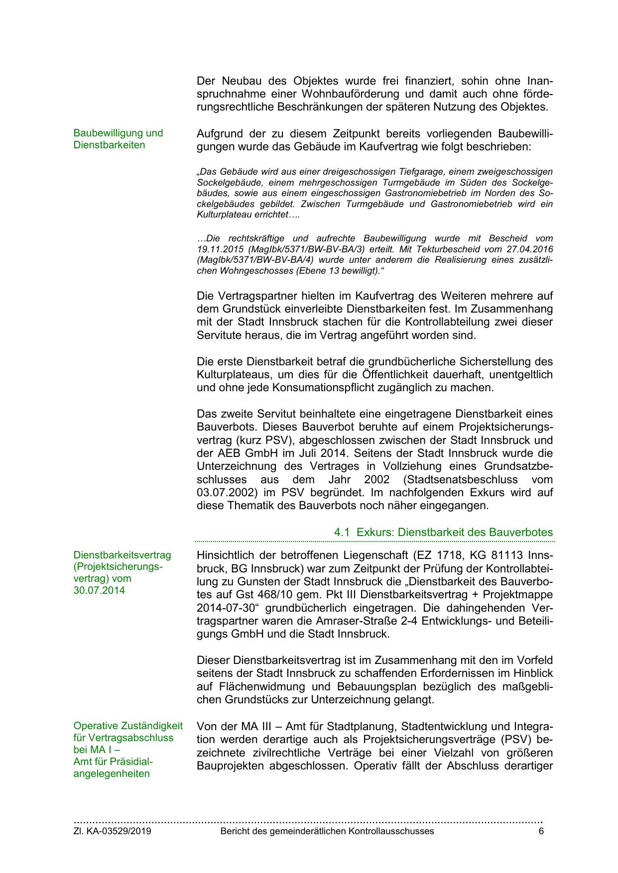 Hinsichtlich der betroffenen Liegenschaft (EZ 1718, KG 81113 Innsbruck, BG Innsbruck) war zum Zeitpunkt der Prüfung der Kontrollabteilung zu Gunsten der Stadt Innsbruck die „Dienstbarkeit des Bauverbotes auf Gst 468/10 gem. Pkt III Dienstbarkeitsvertrag + Projektmappe