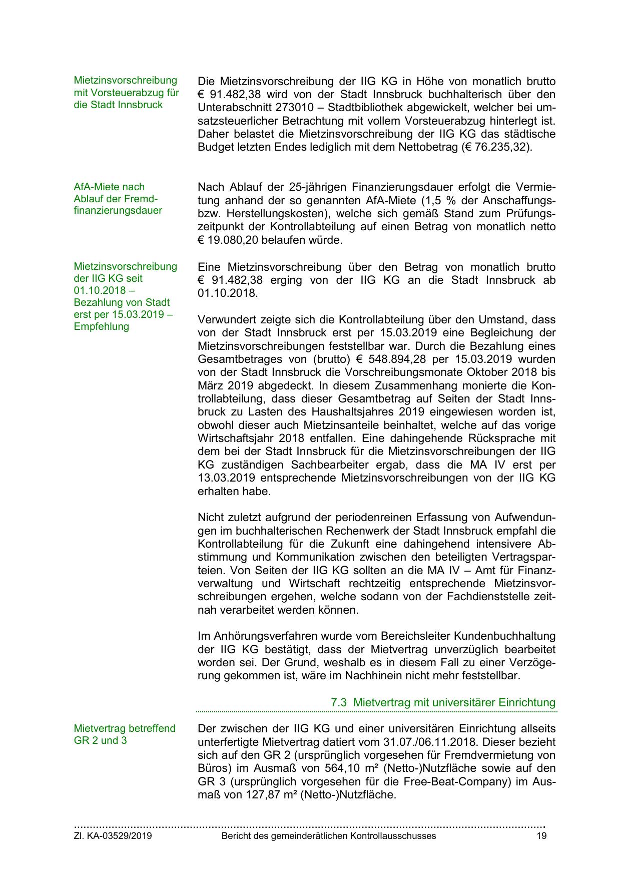 März 2019 abgedeckt. In diesem Zusammenhang monierte die Kontrollabteilung, dass dieser Gesamtbetrag auf Seiten der Stadt Innsbruck zu Lasten des Haushaltsjahres 2019 eingewiesen worden ist,