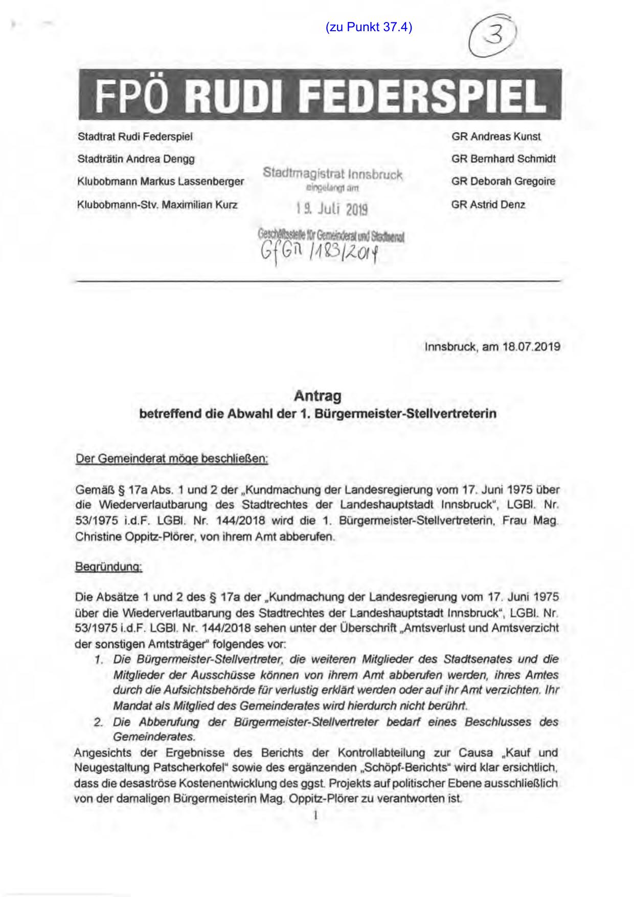 betreffend die Abwahl der 1. Bürgermeister-Stellvertreterin