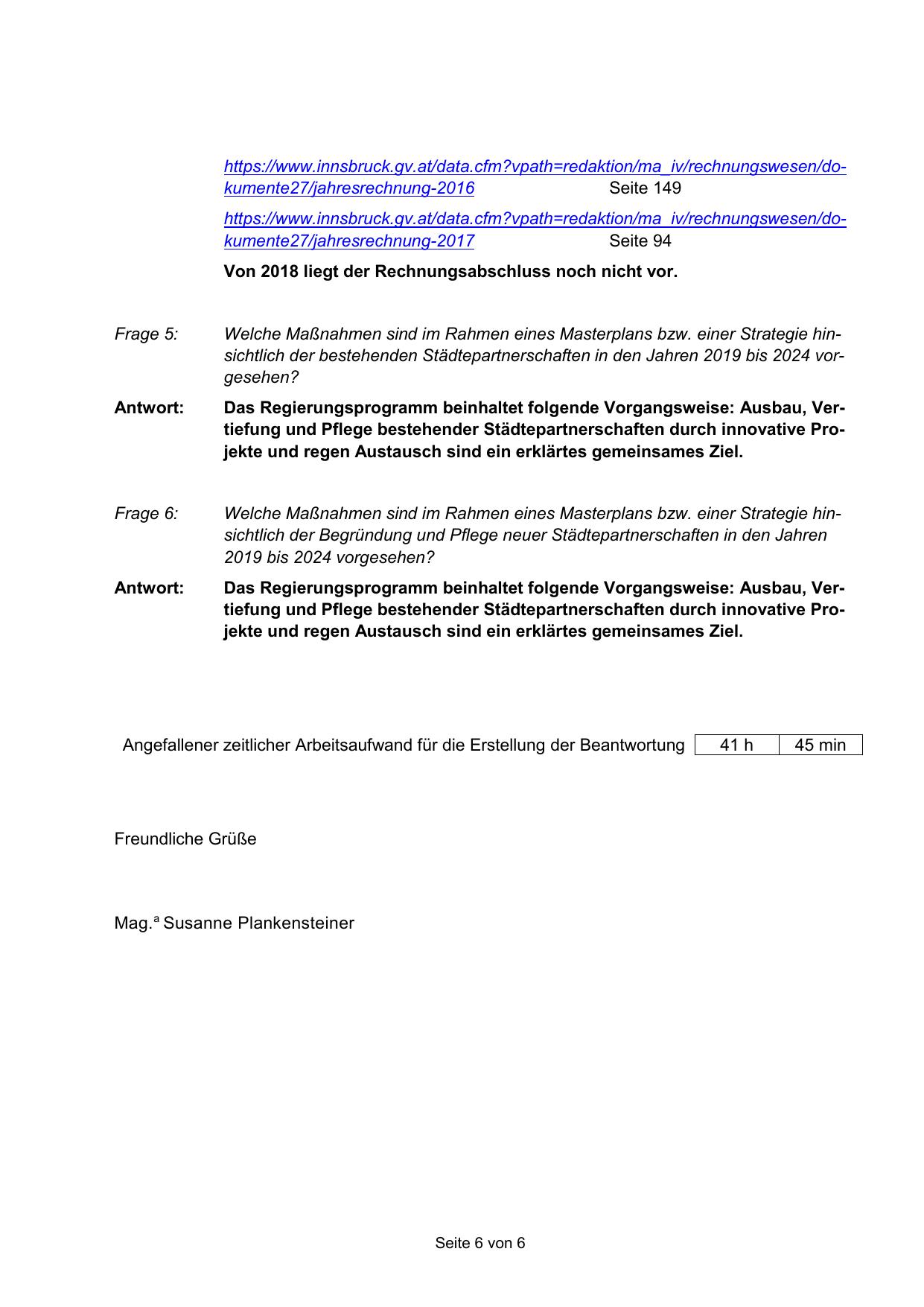 Angefallener zeitlicher Arbeitsaufwand für die Erstellung der Beantwortung