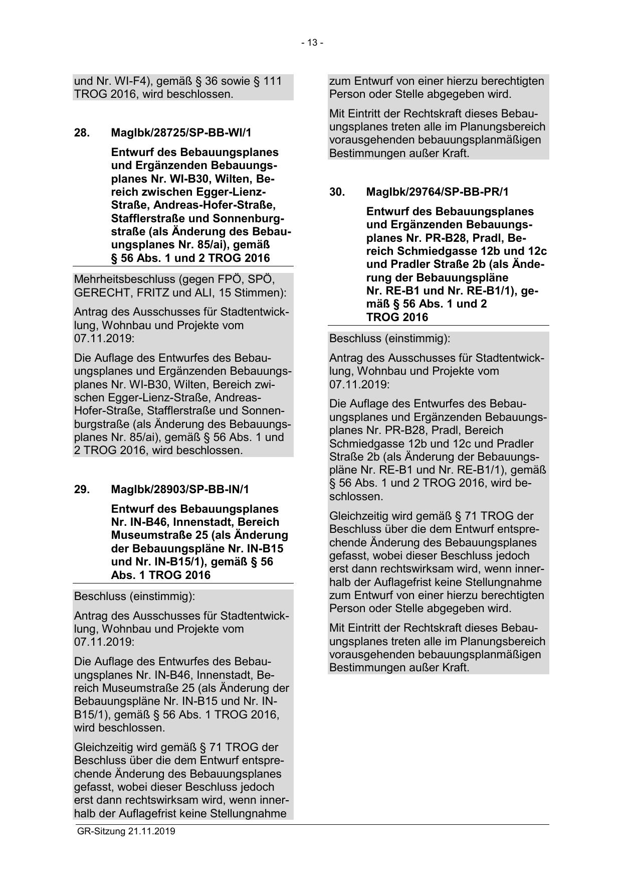 Die Auflage des Entwurfes des Bebauungsplanes und Ergänzenden Bebauungsplanes Nr. WI-B30, Wilten, Bereich zwischen Egger-Lienz-Straße, AndreasHofer-Straße, Stafflerstraße und Sonnenburgstraße (als Änderung des Bebauungsplanes Nr. 85/ai), gemäß § 56 Abs. 1 und