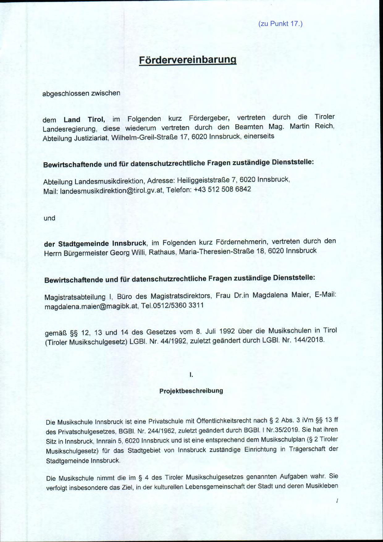 Musikschulgesetz) fur das Stadtgebiet von lnnsbruck zustendige Einrichtung in Tregerschaft der
