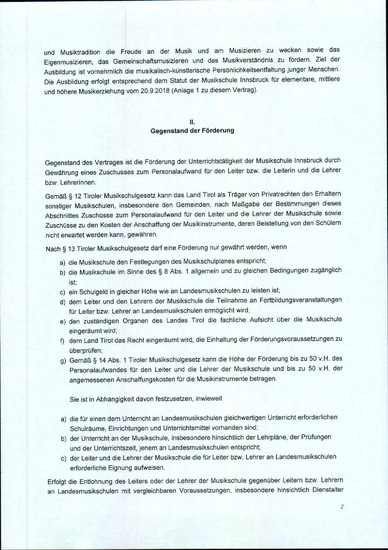 Gegenstand des Vertrages ist die FOrderung der Unterrichtstetigkeit der Musikschule lnnsbruck durch