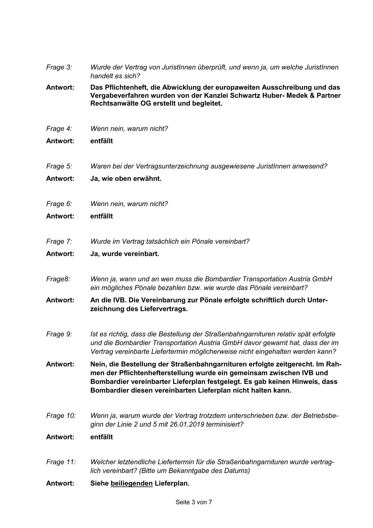 Nein, die Bestellung der Straßenbahngarnituren erfolgte zeitgerecht. Im Rahmen der Pflichtenhefterstellung wurde ein gemeinsam zwischen IVB und