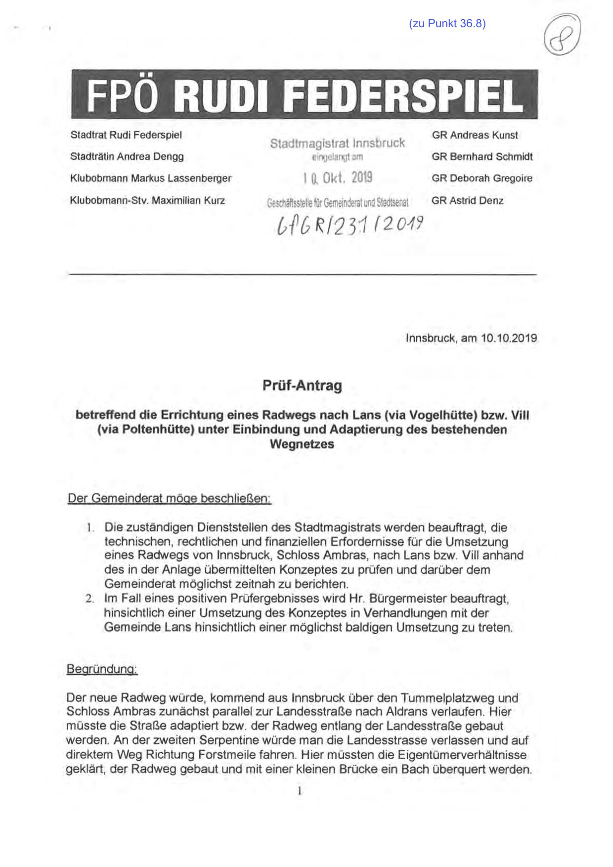 betreffend die Errichtung eines Radwegs nach Lans (via Vogelhütte) bzw. Vill