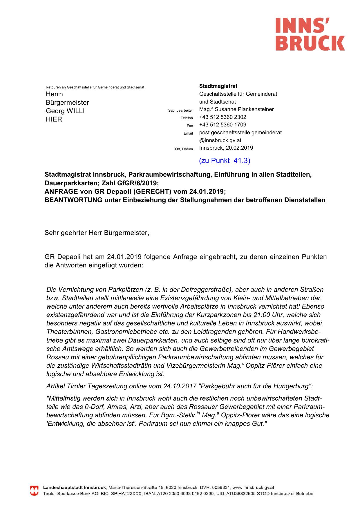 GR Depaoli hat am 24.01.2019 folgende Anfrage eingebracht, zu deren einzelnen Punkten