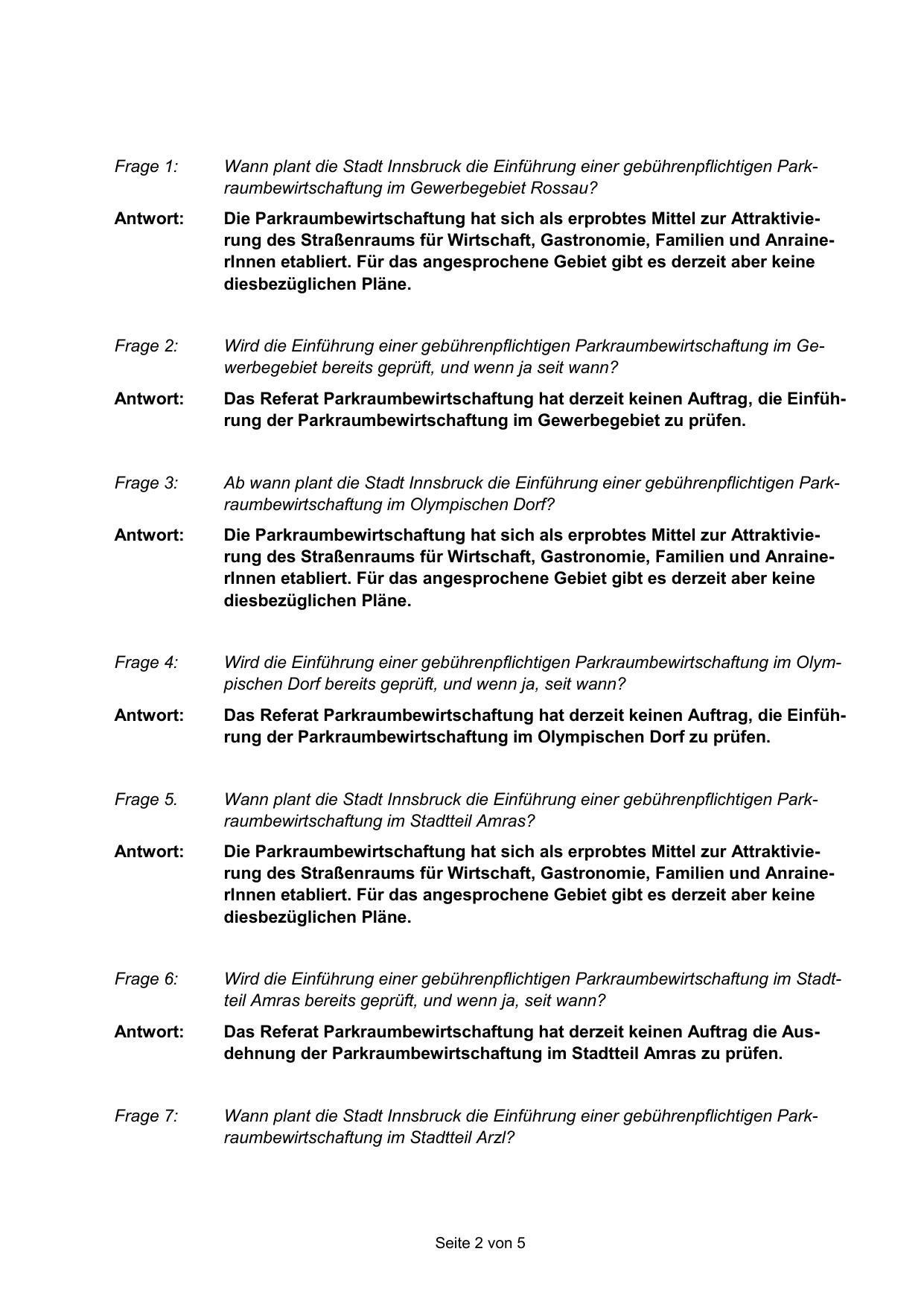 Das Referat Parkraumbewirtschaftung hat derzeit keinen Auftrag die Ausdehnung der Parkraumbewirtschaftung im Stadtteil Amras zu prüfen.