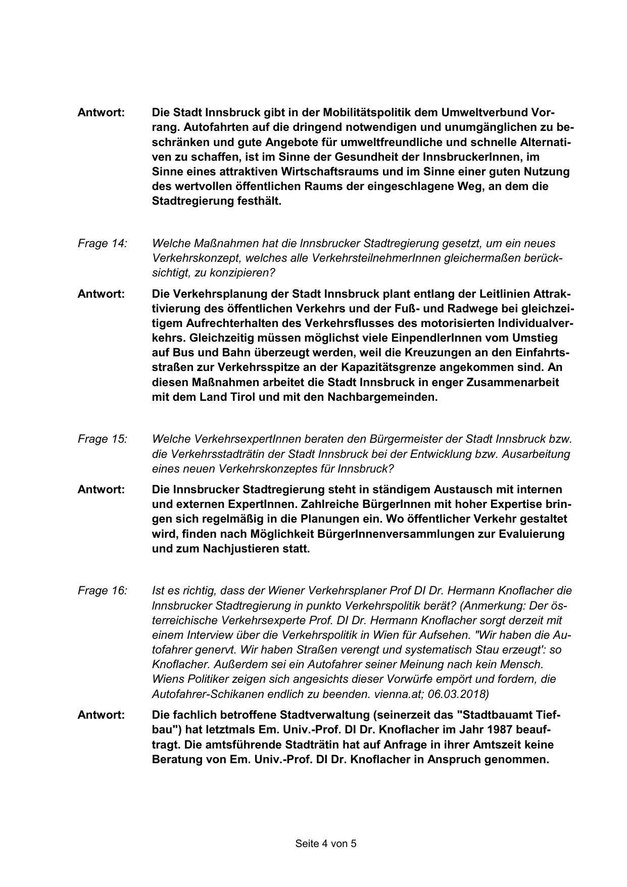 Die fachlich betroffene Stadtverwaltung (seinerzeit das "Stadtbauamt Tiefbau") hat letztmals Em. Univ.-Prof. DI Dr. Knoflacher im Jahr 1987 beauftragt. Die amtsführende Stadträtin hat auf Anfrage in ihrer Amtszeit keine