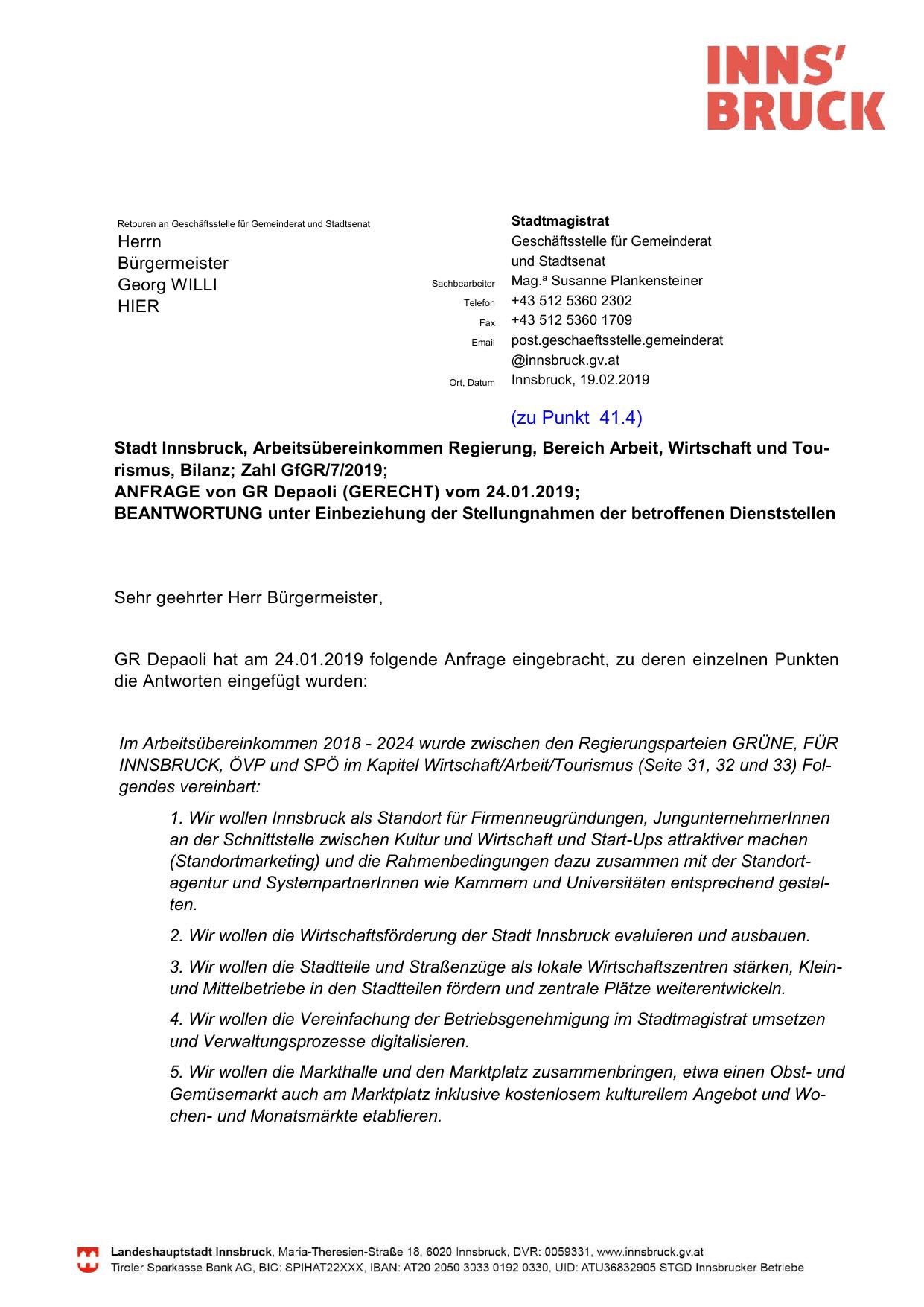 Stadt Innsbruck, Arbeitsübereinkommen Regierung, Bereich Arbeit, Wirtschaft und Tourismus, Bilanz; Zahl GfGR/7/2019;