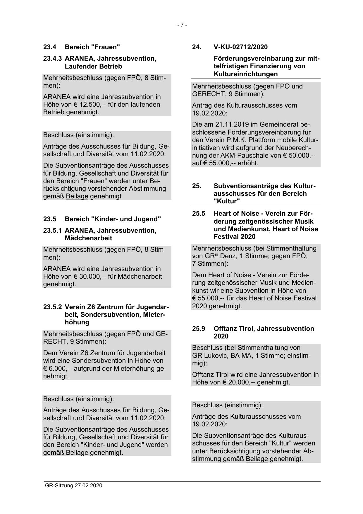 Mehrheitsbeschluss (gegen FPÖ und GERECHT, 9 Stimmen):