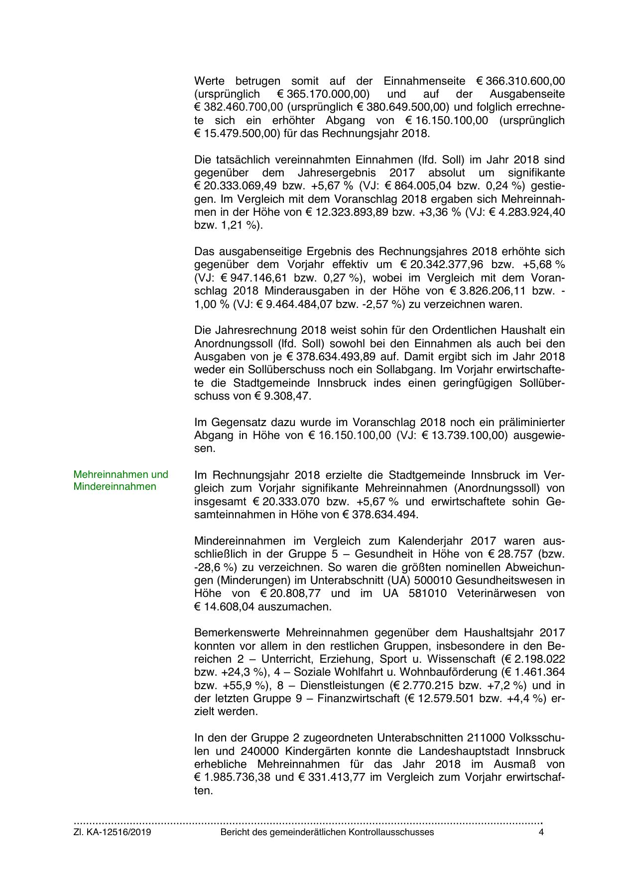 weder ein Sollüberschuss noch ein Sollabgang. Im Vorjahr erwirtschaftete die Stadtgemeinde Innsbruck indes einen geringfügigen Sollüberschuss von € 9.308,47.