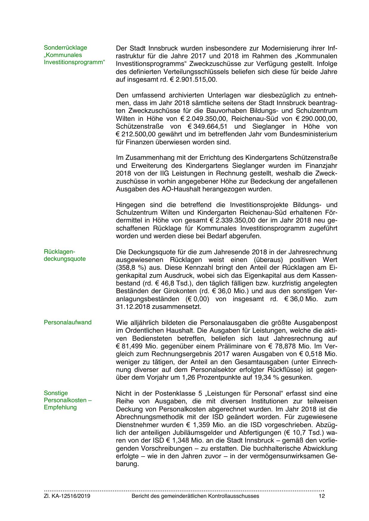 Schulzentrum Wilten und Kindergarten Reichenau-Süd erhaltenen Fördermittel in Höhe von gesamt € 2.339.350,00 der im Jahr 2018 neu geschaffenen Rücklage für Kommunales Investitionsprogramm zugeführt