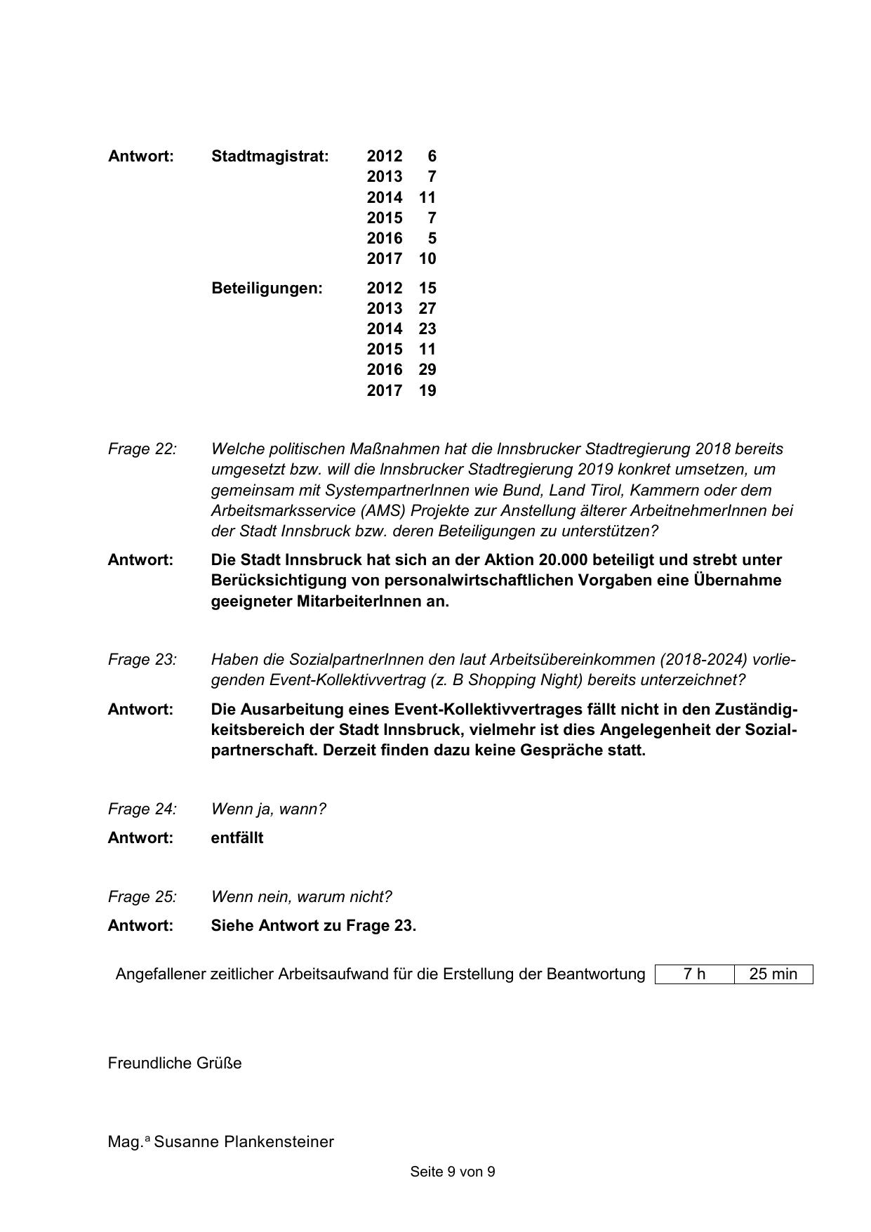 Die Ausarbeitung eines Event-Kollektivvertrages fällt nicht in den Zuständigkeitsbereich der Stadt Innsbruck, vielmehr ist dies Angelegenheit der Sozialpartnerschaft. Derzeit finden dazu keine Gespräche statt.