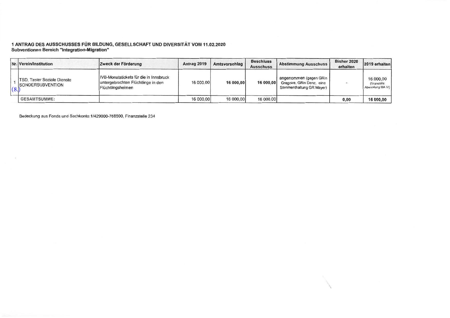 Bedeckung aus Fonds und Sachkonto:1/429000-768500, Finanzstelle 234