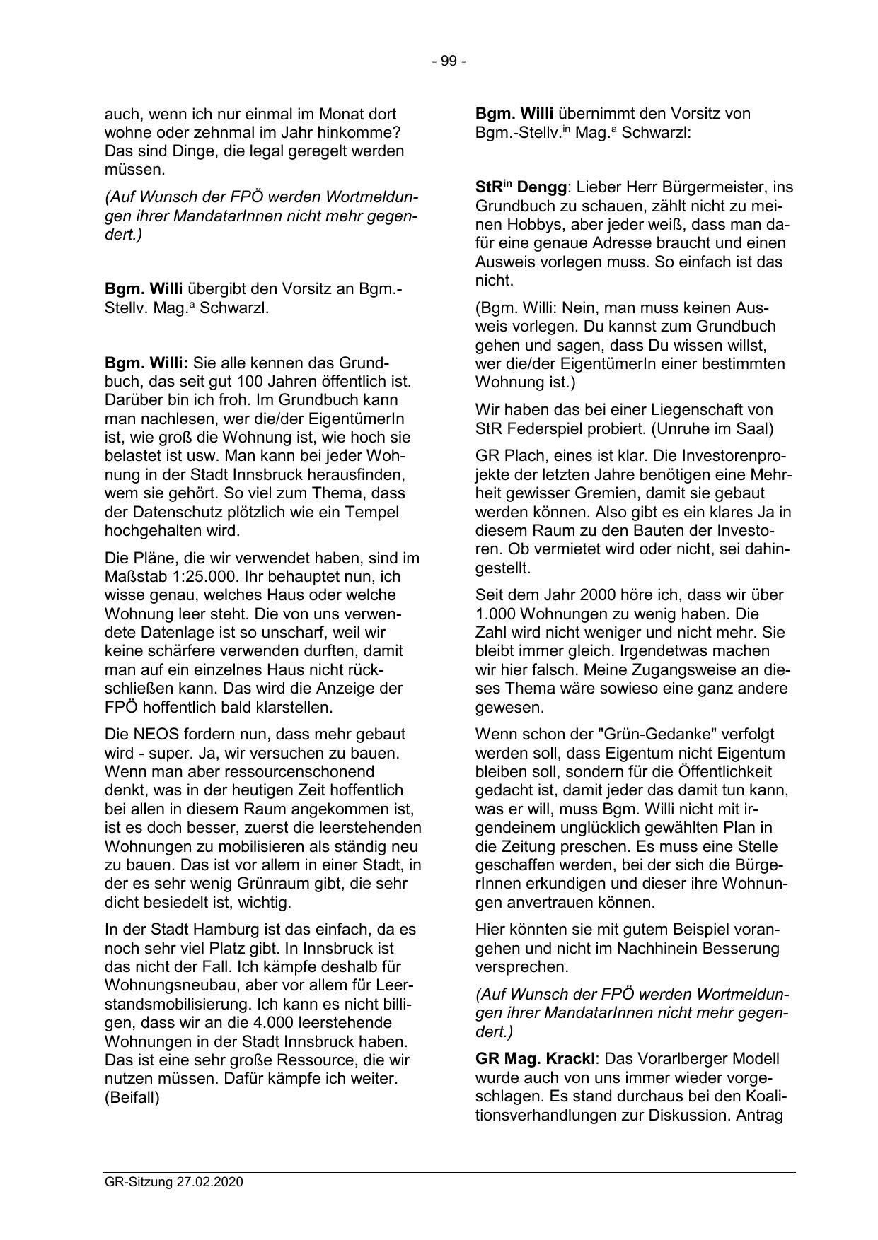 (Auf Wunsch der FPÖ werden Wortmeldungen ihrer MandatarInnen nicht mehr gegendert.)