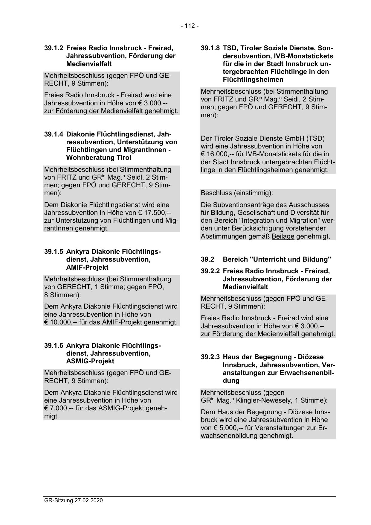 Mehrheitsbeschluss (gegen FPÖ und GERECHT, 9 Stimmen):