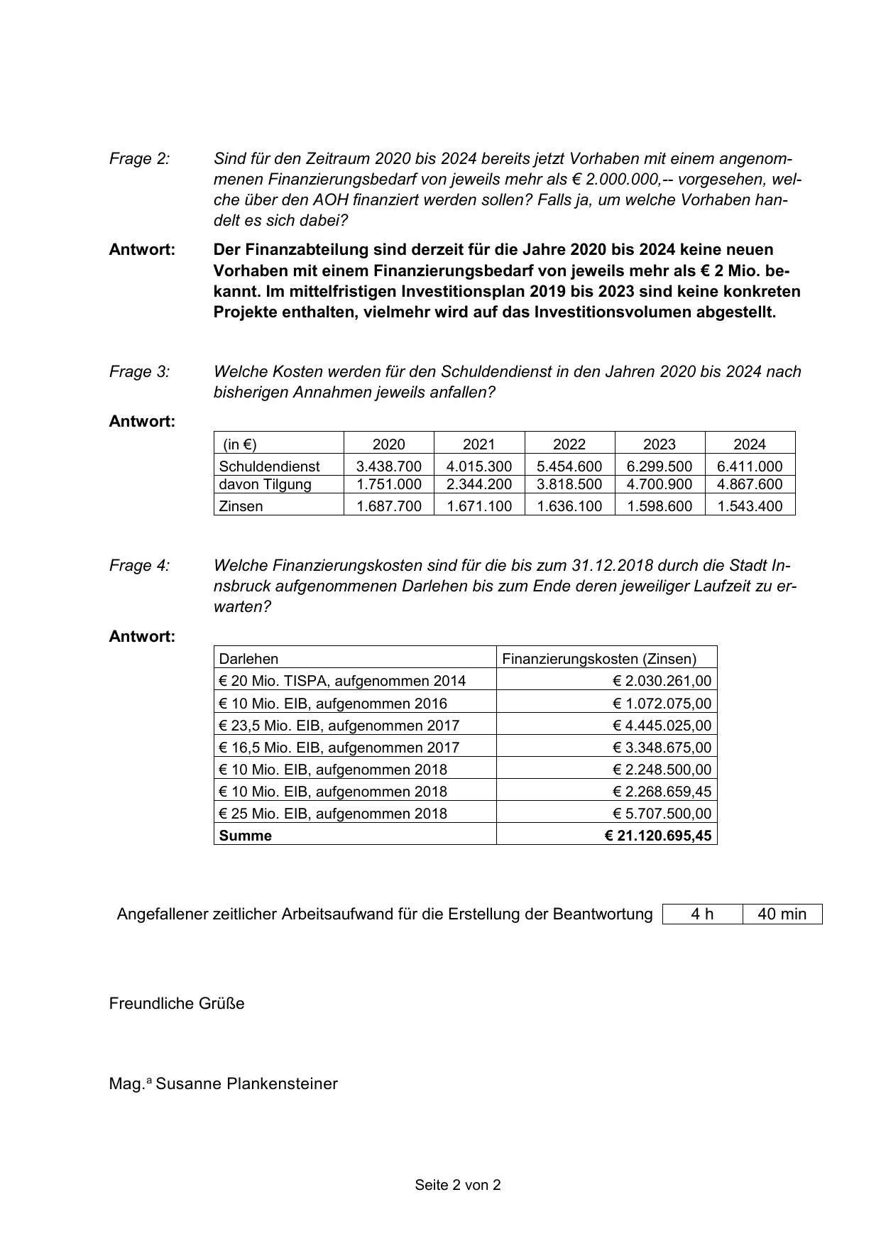 Welche Finanzierungskosten sind für die bis zum 31.12.2018 durch die Stadt Innsbruck aufgenommenen Darlehen bis zum Ende deren jeweiliger Laufzeit zu erwarten?