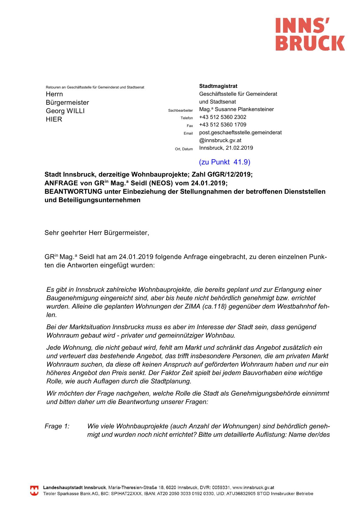 Stadt Innsbruck, derzeitige Wohnbauprojekte; Zahl GfGR/12/2019;