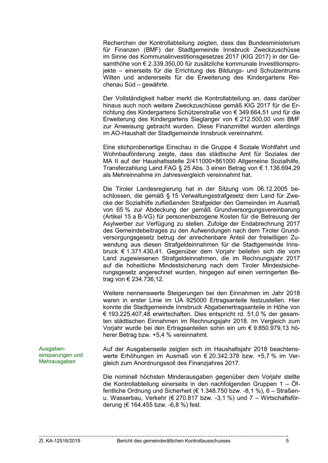 des Gemeindebeitrages zu den Aufwendungen nach dem Tiroler Grundversorgungsgesetz betrug der anrechenbare Anteil der freiwilligen Zuwendung aus diesen Strafgeldeinnahmen für die Stadtgemeinde Innsbruck € 1.371.430,41. Gegenüber dem Vorjahr beliefen sich die vom