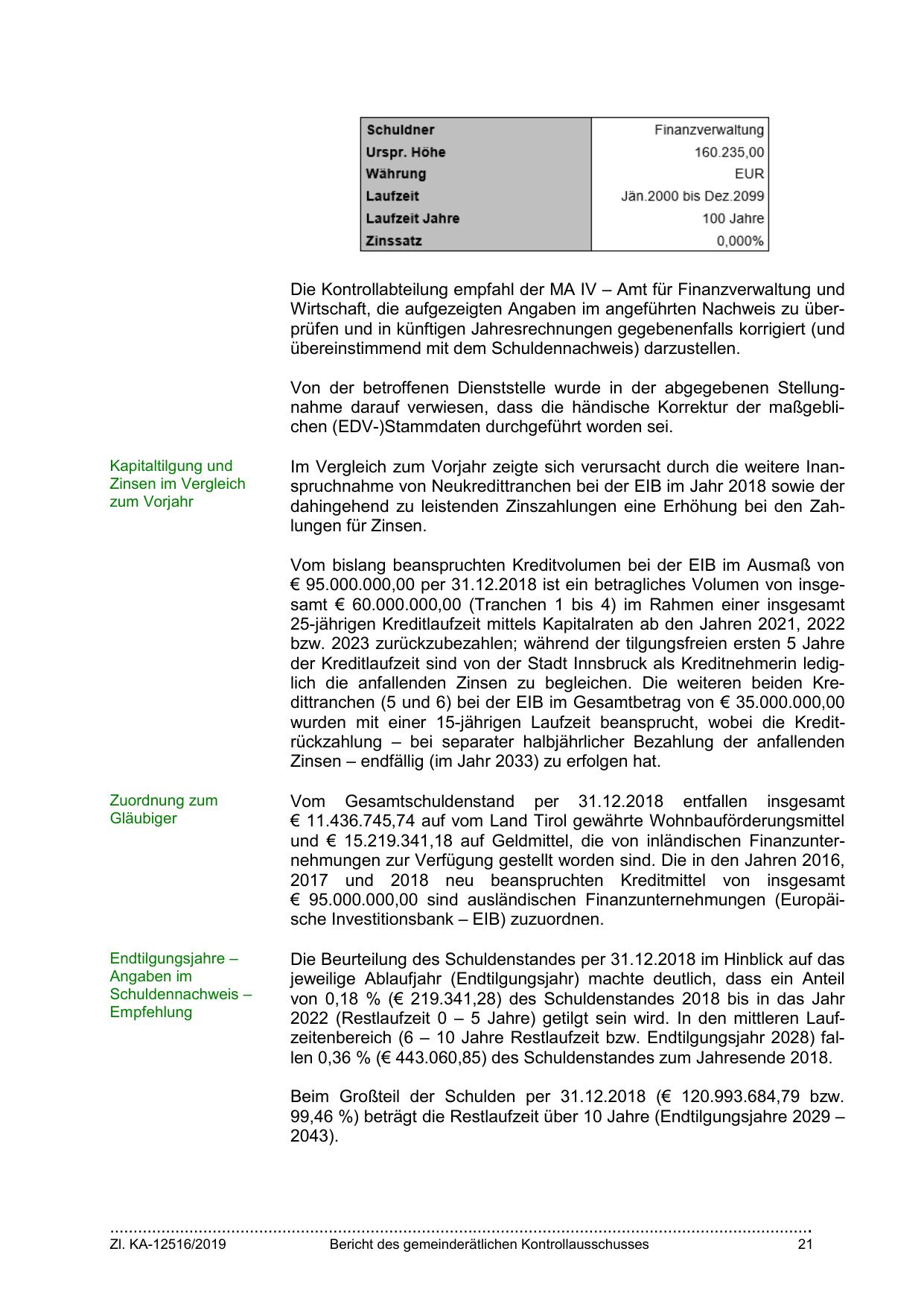 der Kreditlaufzeit sind von der Stadt Innsbruck als Kreditnehmerin lediglich die anfallenden Zinsen zu begleichen. Die weiteren beiden Kredittranchen (5 und 6) bei der EIB im Gesamtbetrag von € 35.000.000,00