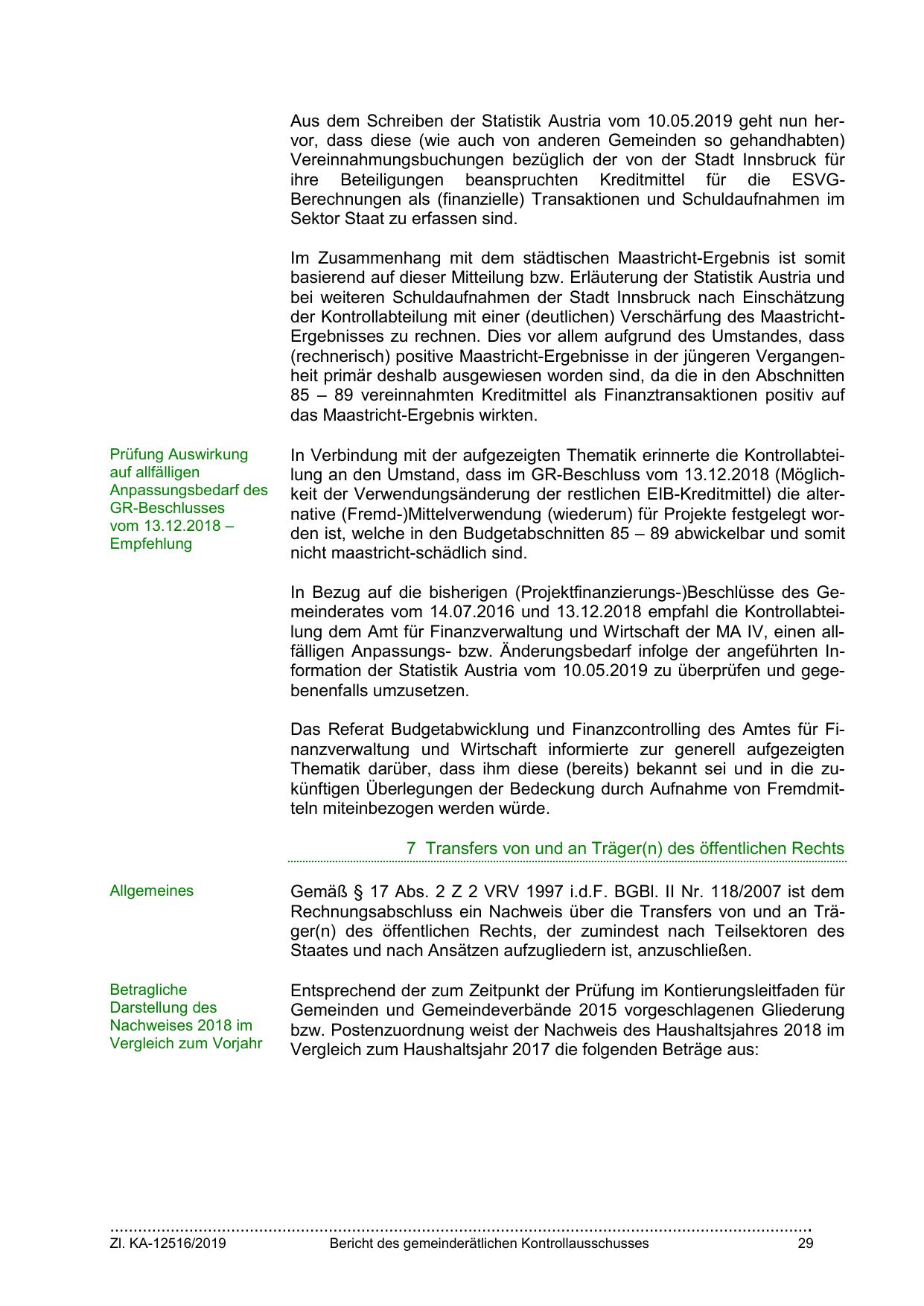 In Bezug auf die bisherigen (Projektfinanzierungs-)Beschlüsse des Gemeinderates vom 14.07.2016 und 13.12.2018 empfahl die Kontrollabteilung dem Amt für Finanzverwaltung und Wirtschaft der MA IV, einen allfälligen Anpassungs- bzw. Änderungsbedarf infolge der angeführten Information der Statistik Austria vom 10.05.2019 zu überprüfen und gegebenenfalls umzusetzen.