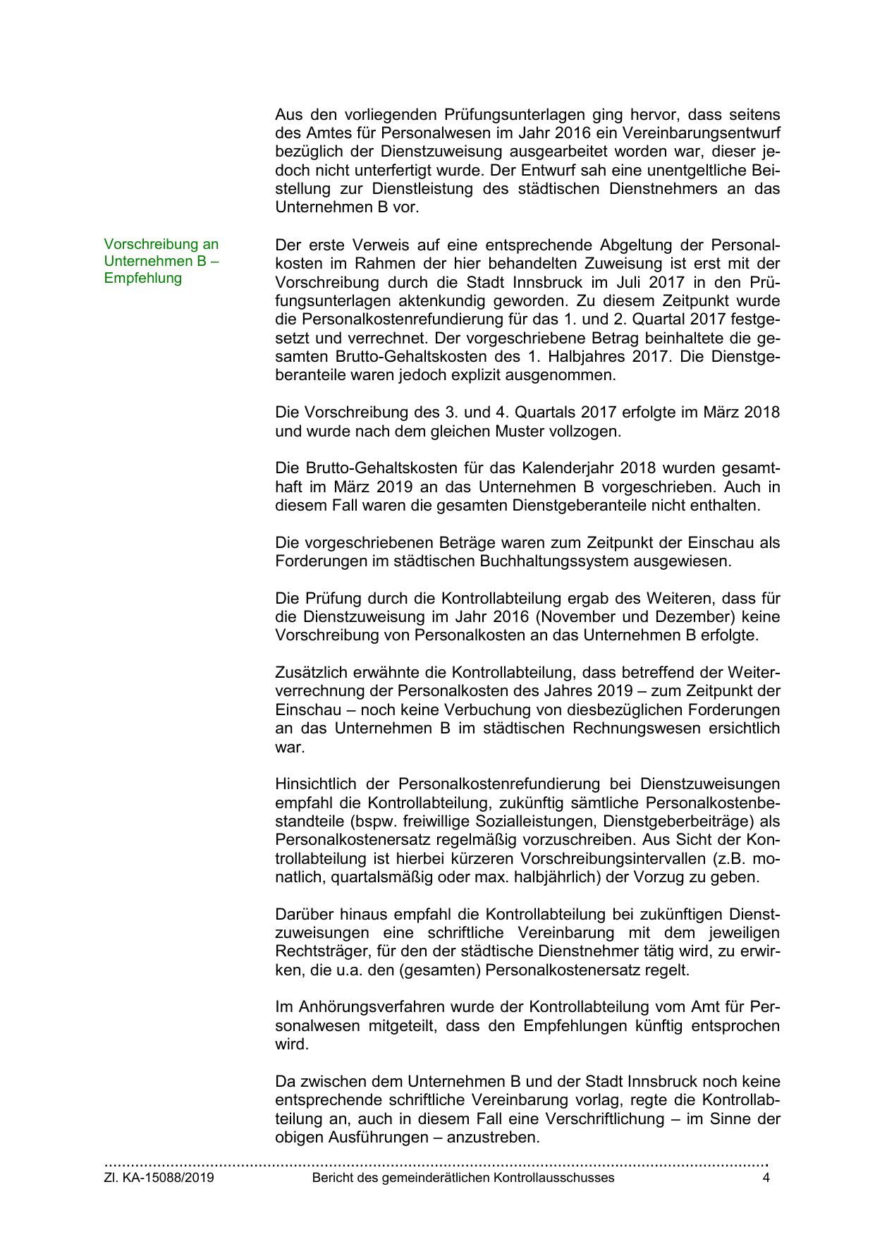 Zusätzlich erwähnte die Kontrollabteilung, dass betreffend der Weiterverrechnung der Personalkosten des Jahres 2019 – zum Zeitpunkt der