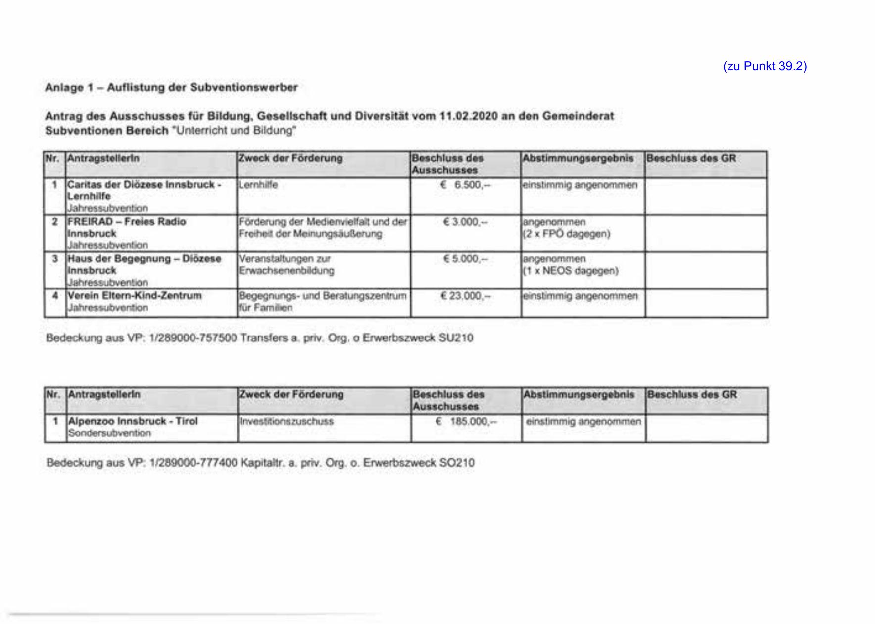 Bedeckung aus VP: 1/289000-777400 Kapitaltr. a. priv. Org. o. Erwerbszweck SO210